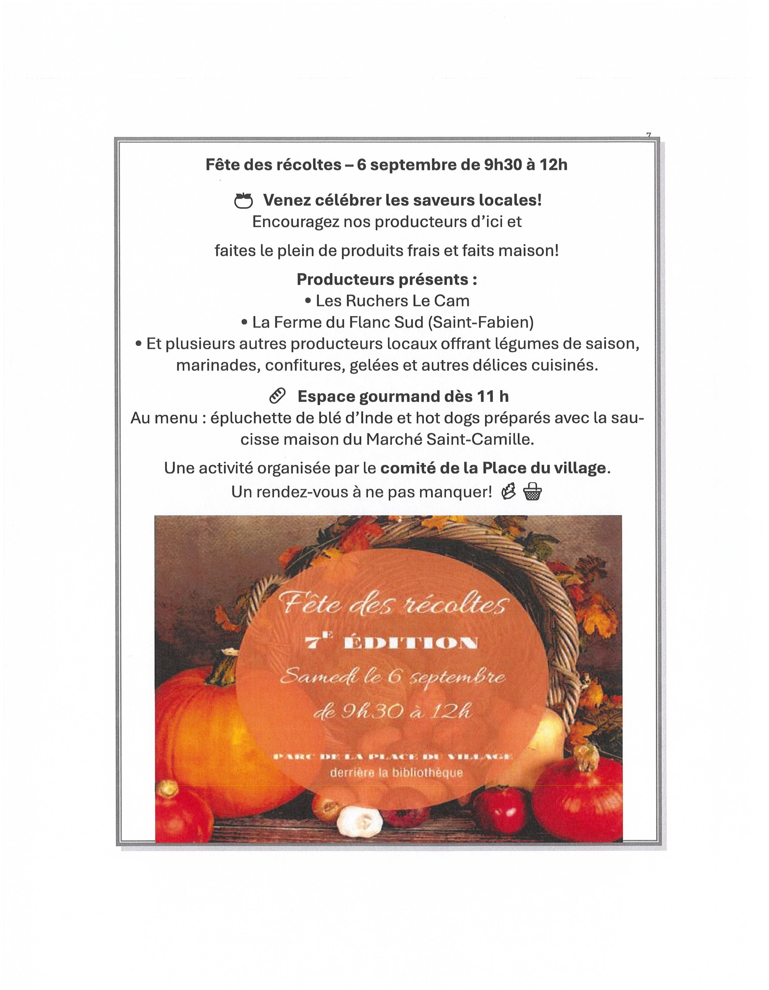 SAINT-CAMILLE. Divers producteurs et artisans locaux s’étaient donné rendez-vous sur la Place du Village de Saint-Camille, derrière la bibliothèque municipale, pour la troisième édition de la Fête des récoltes, événement qui ne cesse de gagner en popularité.