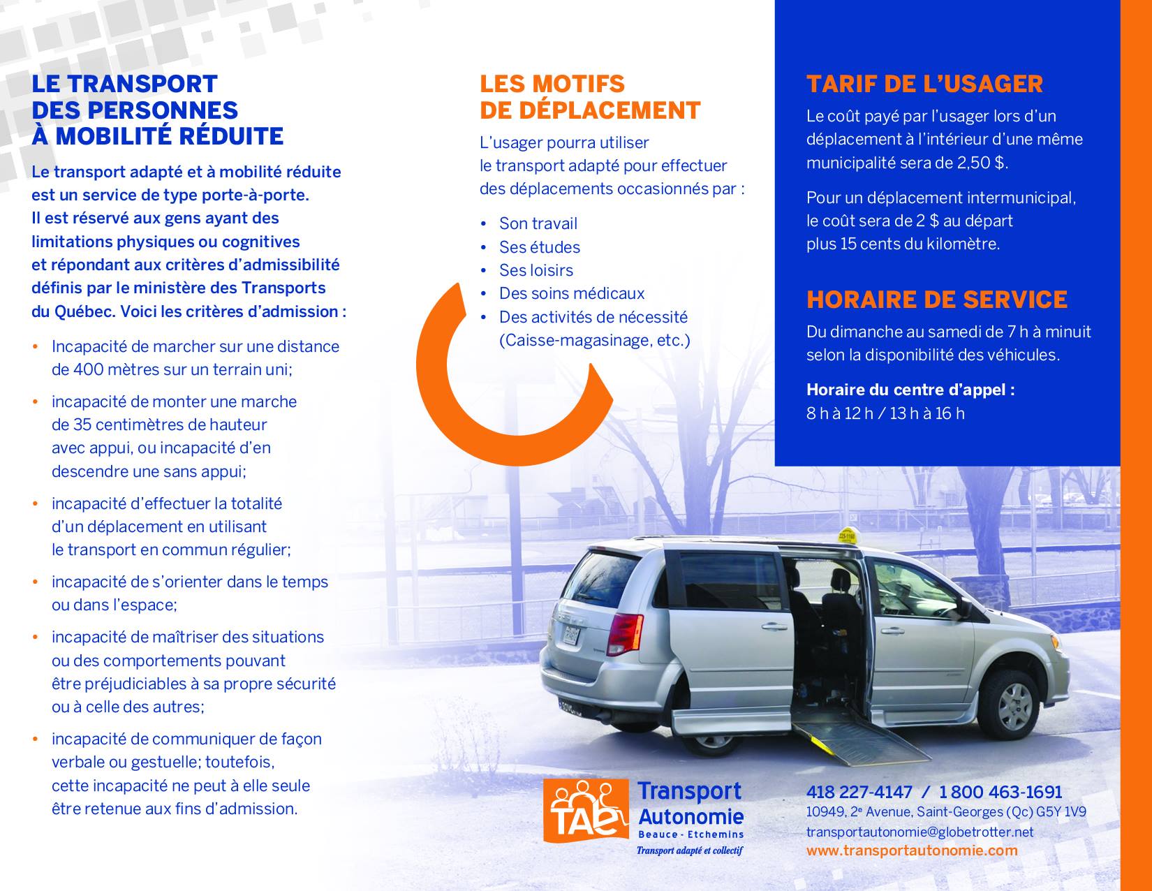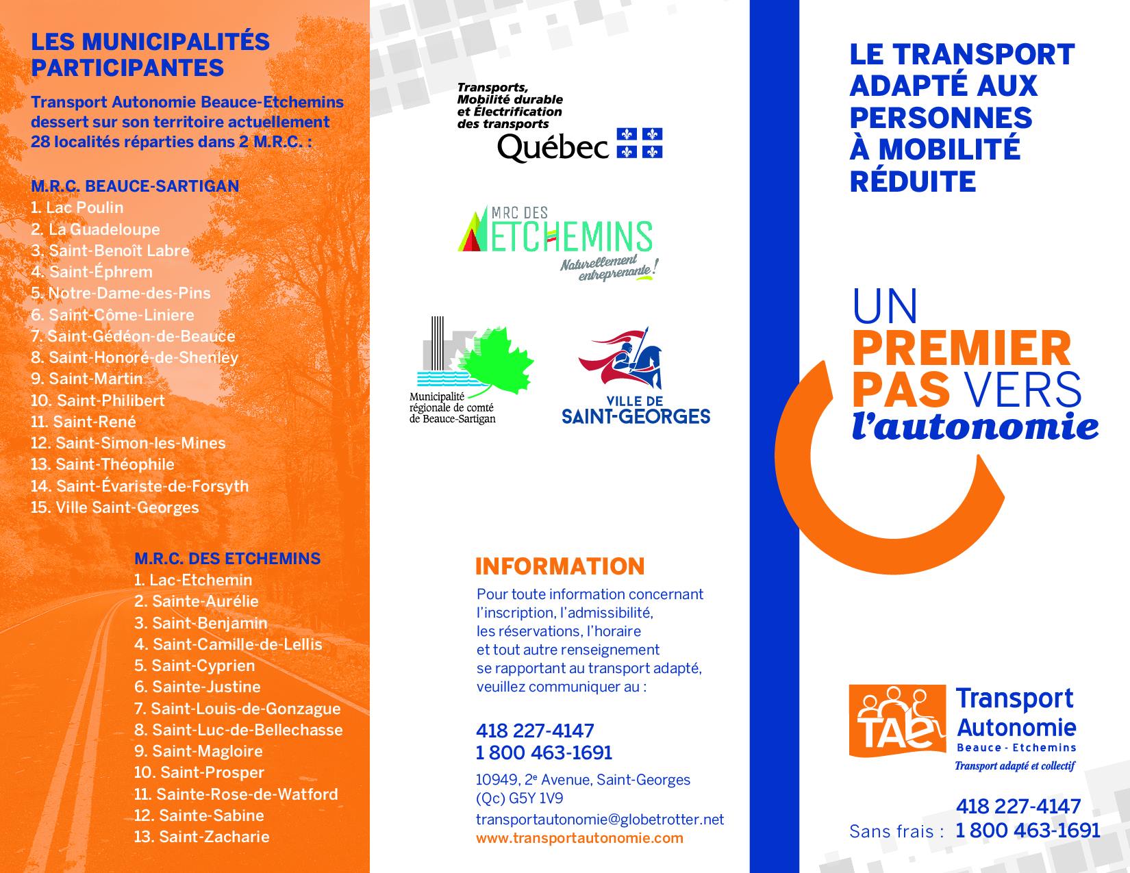 Pour toutes informations concernant l’inscription, l’admission, les réservations, l’horaire et tous renseignements se rapportant au transport adapté, veuillez communiquer avec nous ou visiter notre site internet au www.transportautonomie.com
